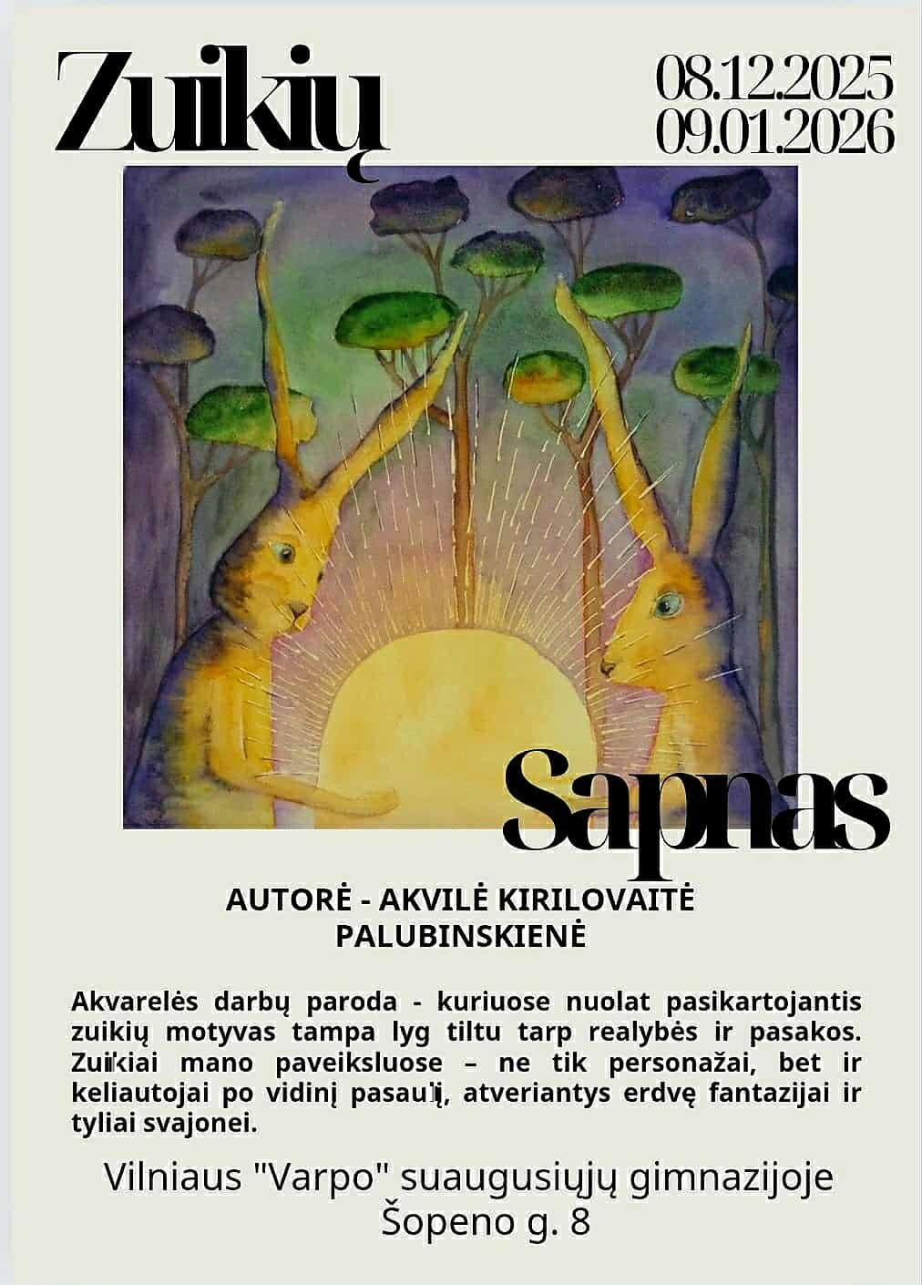 Vilniaus „Varpo“ suaugusiųjų gimnazijoje (Šopeno g. 8) atidaryta VJK „Klevas“ mokytojos Akvilės Kirilovaitės Palubinskienės akvarelės darbų paroda „Zuikio sapnas“. Šiuose kūriniuose nuolat pasikartojantis zuikio motyvas tampa tiltu tarp realybės ir pasakos.